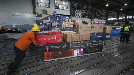 Personas organizan una carga de flores en el Aeropuerto Internacional Mariscal Sucre en Quito a propósito de San Valentín.