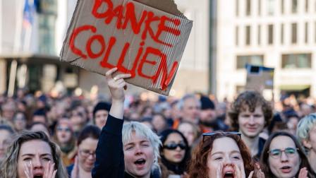 Una participante en la manifestación de apoyo a la actriz sostiene un cartel con el lema "Gracias, Collien", el 22 de marzo en Berlín.