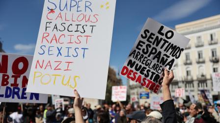 Cartel que dice "Lo sentimos, España, arreglaremos nuestro desastre" durante una protesta contra las políticas de Donald Trump en el marco del movimiento "No Kings Day" en Madrid.