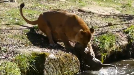 Leona se enfrenta a macho para salvar a su cría de morir ahogada