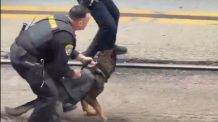 Un perro policía K-9 interviene para neutralizar a un hombre acusado de apuñalar a un empleado de un estacionamiento en San Diego - California.